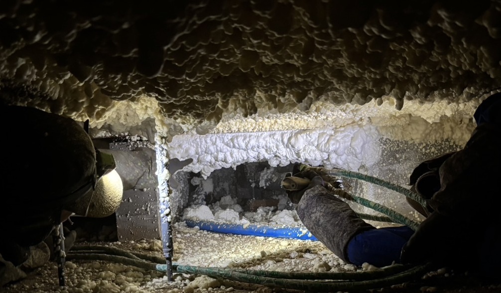 床下にもぐり、床面にウレタンを吹付けする内容です。